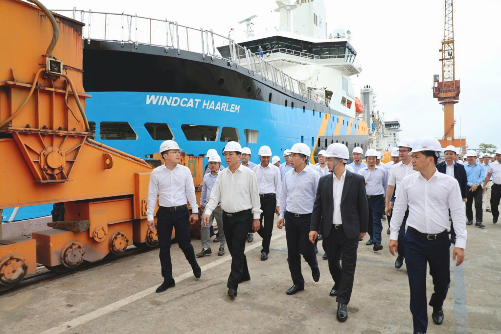 Bộ trưởng Trần Hồng Minh kiểm tra thực tế hoạt động tại Công ty TNHH Một thành viên Đóng tàu Nam Triệu.