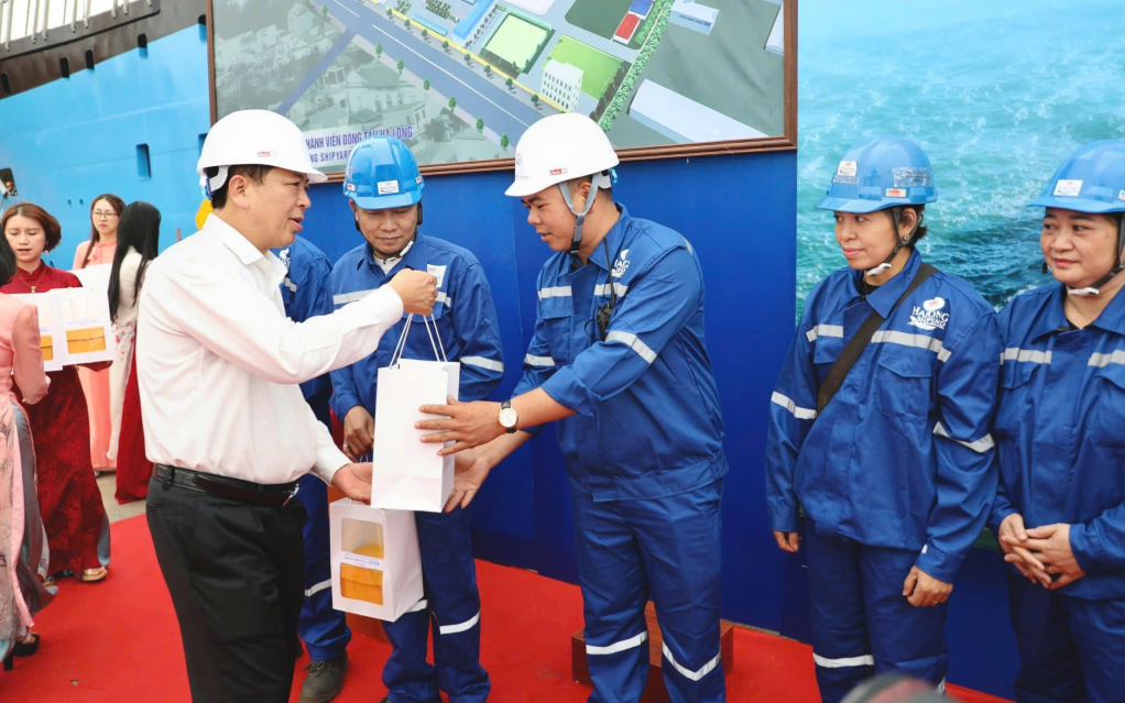 Uỷ viên Ban Chấp hành Trung ương Đảng, Bộ trưởng Bộ Xây dựng Trần Hồng Minh tặng quà cho các công nhân lao động tiêu biểu của Nhà máy đóng tàu Hạ Long.
