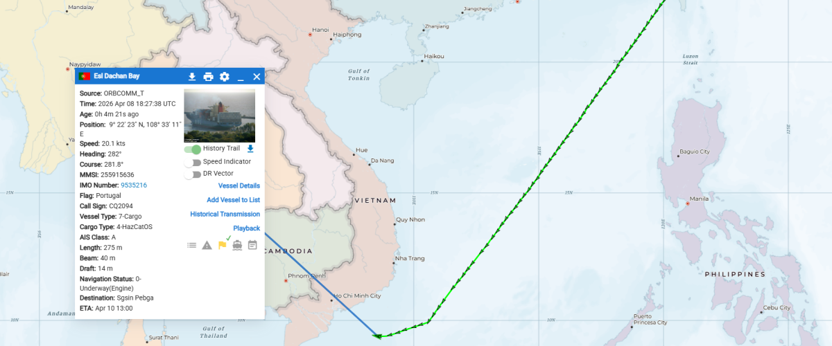 Hồi 20 giờ 40 phút ngày 08/4/2026, Trung tâm đã tiếp nhận thông tin từ tàu Container ESL DACHAN BAY quốc tịch Bồ Đào Nha và đại diện chủ tàu (Công ty TNHH TM và logistic Thái Bình Dương) về việc một thuyền viên trên tàu đang trong tình trạng sức khỏe nguy hiểm trong khi tàu đang hành trình từ Đài Loan đi Singapore.