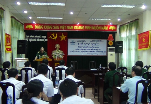 Chiều ngày 25/4/2014, Lễ ký Quy chế phối hợp giữa Cảng vụ Hàng hải Nghệ An và Bộ Chỉ huy Bộ đội Biên phòng tỉnh Nghệ An được diễn ra tại trụ sở Cảng vụ Hàng hải Nghệ An. Tham dự Lễ ký, về phía Cảng vụ Hàng hải Nghệ An, có sự tham gia của Bí thư chi bộ, Quyền Giám đốc Đặng Văn Ba, đại diện các phòng tham mưu Cảng vụ Hàng hải Nghệ An. Về phía Bộ Chỉ huy Bộ đội Biên phòng tỉnh Nghệ An có: Đại tá Hoàng Ngọc Năm – Phó Chỉ huy trưởng Bộ chỉ huy Bộ đội Biên phòng tỉnh Nghệ An, lãnh đạo các phòng nghiệp vụ thuộc Bộ Chỉ huy Bộ đội Biên phòng Nghệ An, lãnh đạo Đồn Biên phòng cửa khẩu cảng Cửa Lò – Bến Thủy.