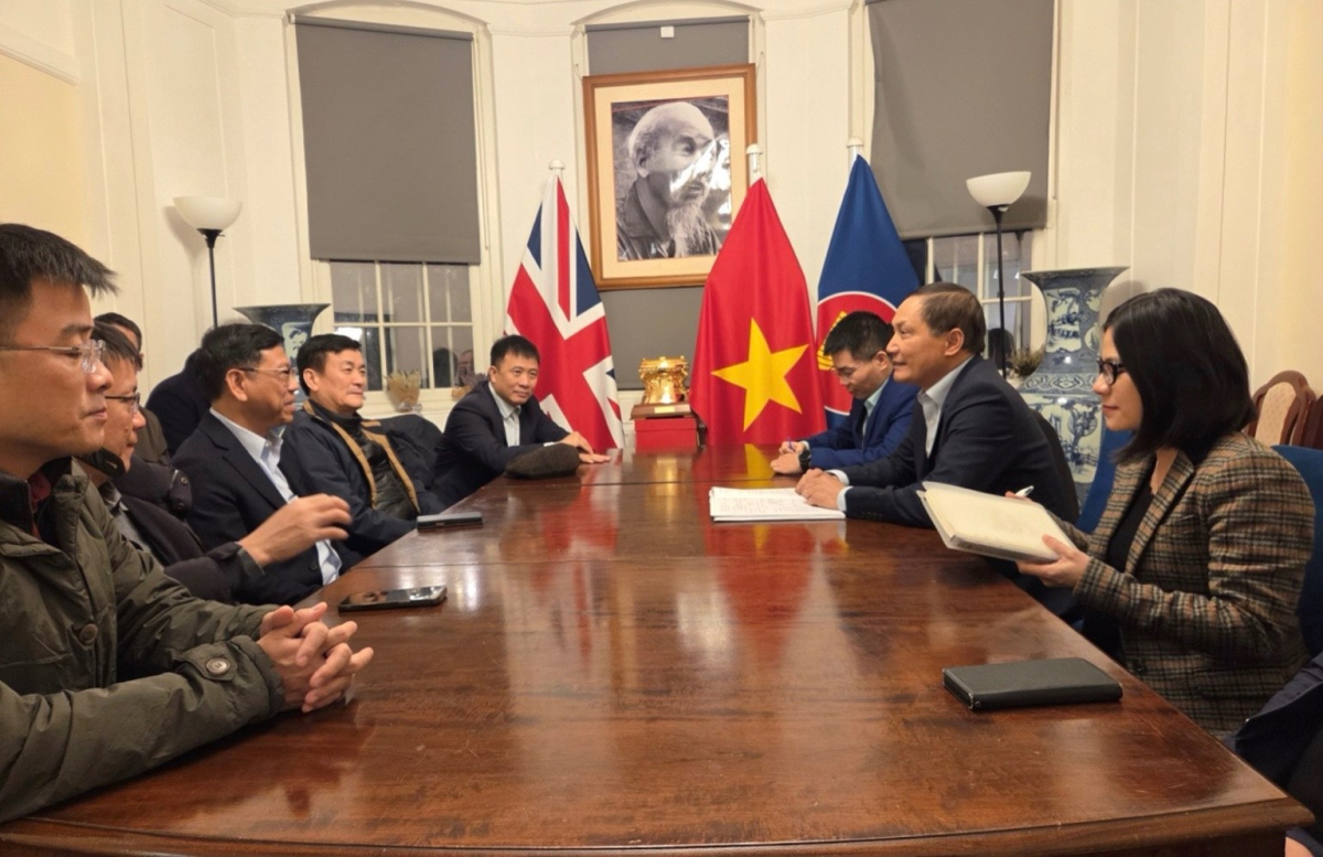 Thứ trưởng Nguyễn Xuân Sang làm việc với Đại sứ đặc mệnh toàn quyền Việt Nam tại Vương quốc Anh Đỗ Minh Hùng (bên phải)