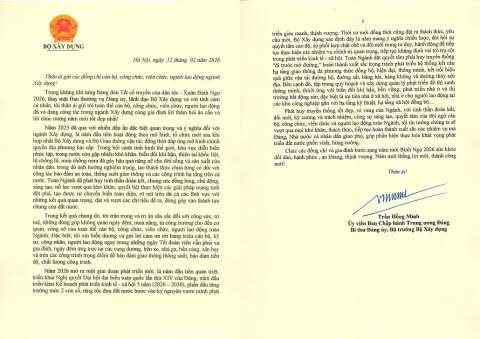 Nhân dịp năm mới 2026 và đón Xuân Bính Ngọ, Bộ trưởng Bộ Xây dựng Trần Hồng Minh đã gửi thư chúc Tết cán bộ, công chức, viên chức, người lao động ngành Xây dựng. Cổng Thông tin điện tử Cục Hàng hải...
