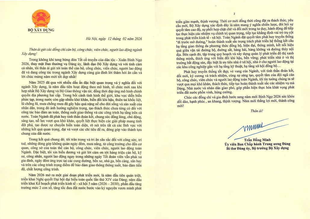 Nhân dịp năm mới 2026 và đón Xuân Bính Ngọ, Bộ trưởng Bộ Xây dựng Trần Hồng Minh đã gửi thư chúc Tết cán bộ, công chức, viên chức, người lao động ngành Xây dựng. Cổng Thông tin điện tử Cục Hàng hải và Đường thuỷ Việt Nam xin trân trọng đăng toàn văn Thư của Bộ trưởng Trần Hồng Minh.