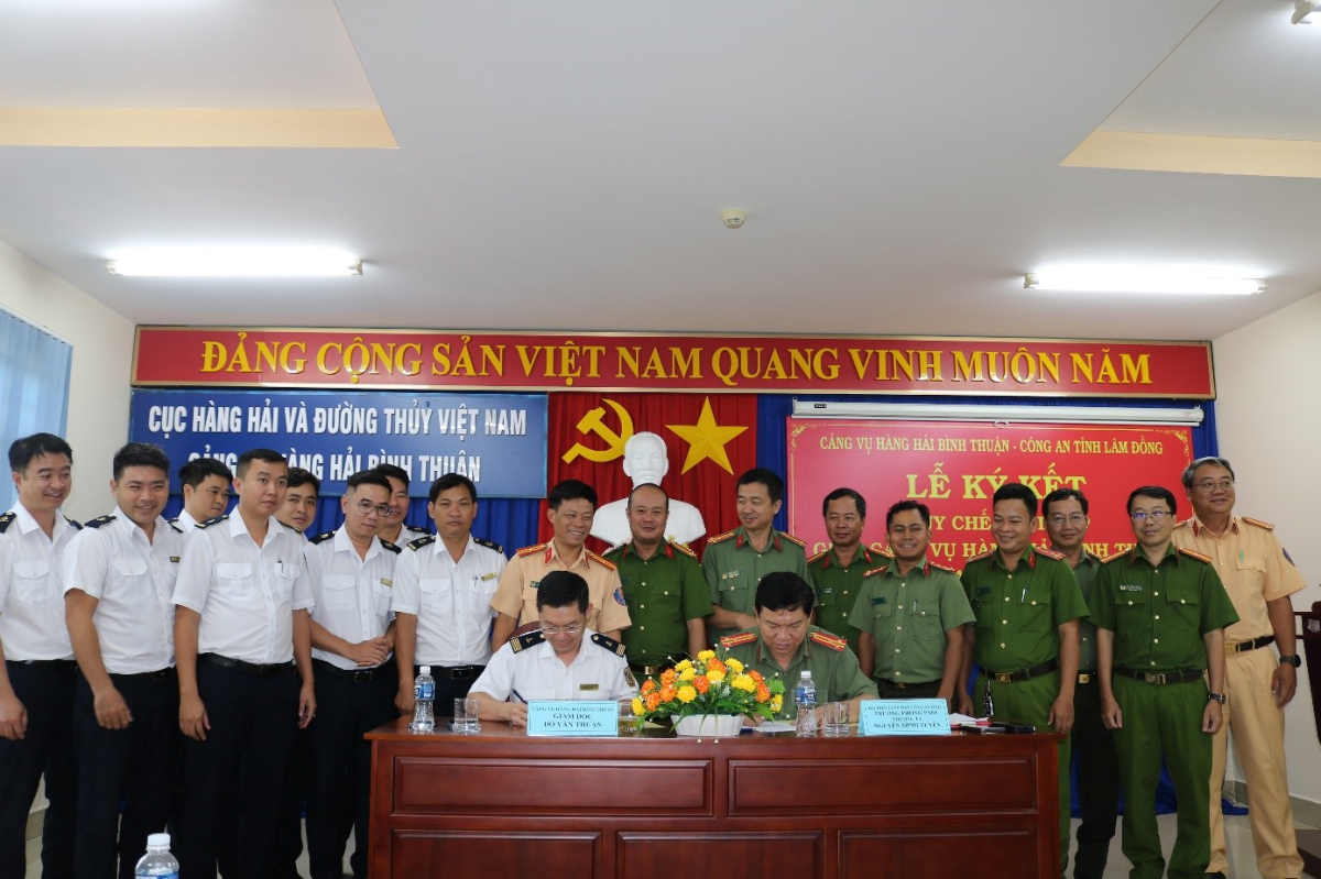 Sáng ngày 31/03/2026, tại hội trường đơn vị, Cảng vụ Hàng hải Bình Thuận đã long trọng tổ chức Lễ ký kết Quy chế phối hợp mới với Công an tỉnh Lâm Đồng. Tham dự buổi lễ, về phía Cảng vụ Hàng hải Bình Thuận có đồng chí Đỗ Văn Thuận - Giám đốc, cùng các đồng chí lãnh đạo phòng ban, đại diện và các đồng chí chuyên viên. Về phía Công an tỉnh Lâm Đồng có đồng chí Thượng tá Nguyễn Minh Tuyên - Trưởng phòng An ninh kinh tế chủ trì đoàn công tác theo ủy quyền của Lãnh đạo Công an tỉnh. Cùng dự có đại diện lãnh đạo các đơn vị nghiệp vụ: Phòng Cảnh sát kinh tế, Phòng Cảnh sát PCCC&CNCH, Phòng Cảnh sát giao thông và đại diện lãnh đạo Công an các địa phương: xã Vĩnh Hảo, xã Phan Rí Cửa, Phường Phan Thiết và Đặc khu Phú Quý.